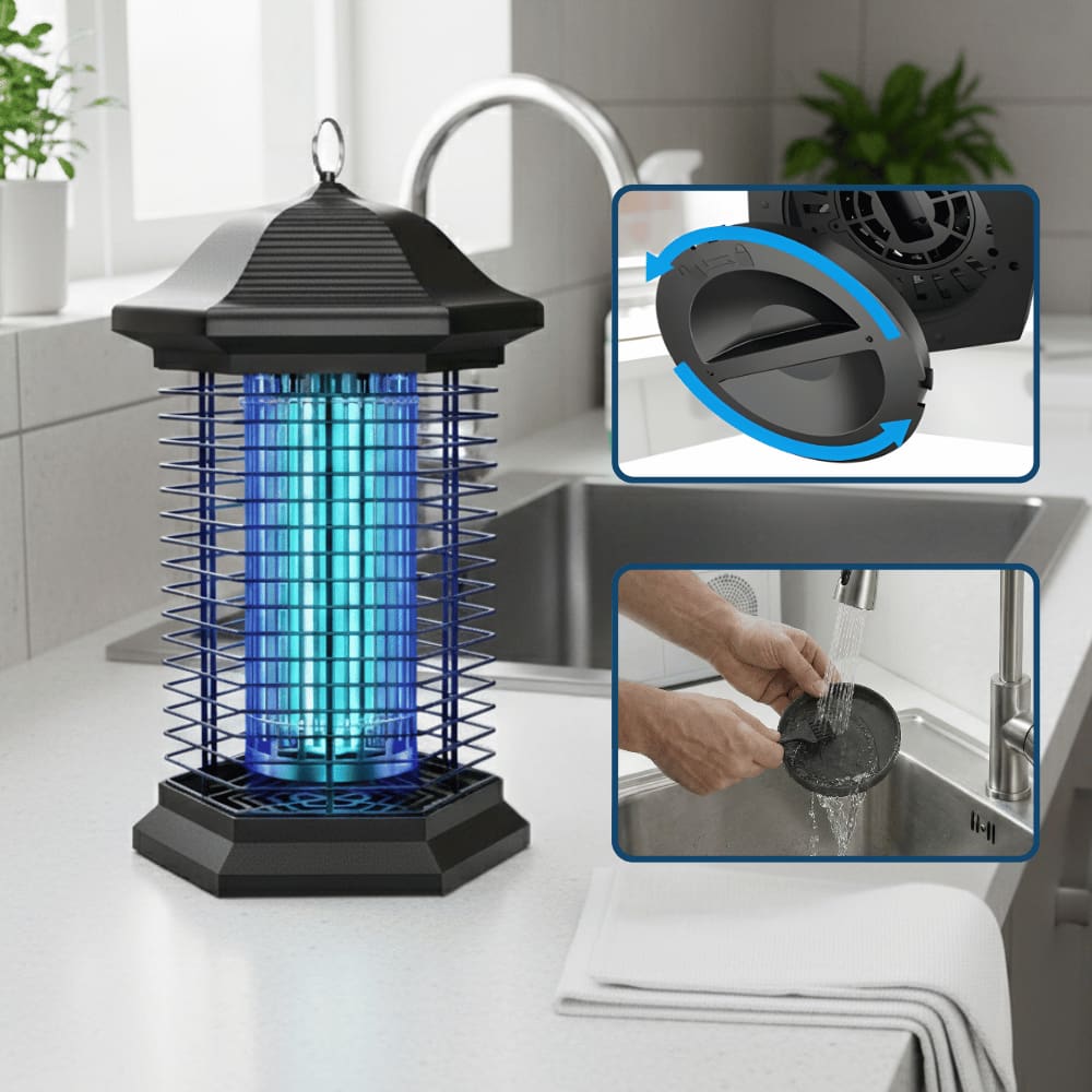 The device uses exclusive UVA light waves to attract insects. A high-voltage grid up to 4,400 volts eliminates them instantly upon contact—without chemicals or sprays.