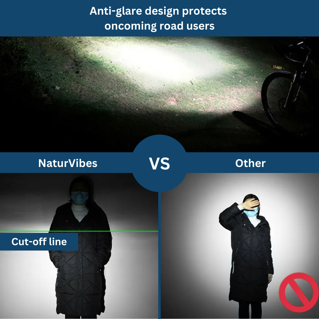 The Maxi Frontlight by NaturVibes delivers up to 6000 lumens with a range of 1640 feet (500 meters), providing clear visibility and maximum safety on every ride.