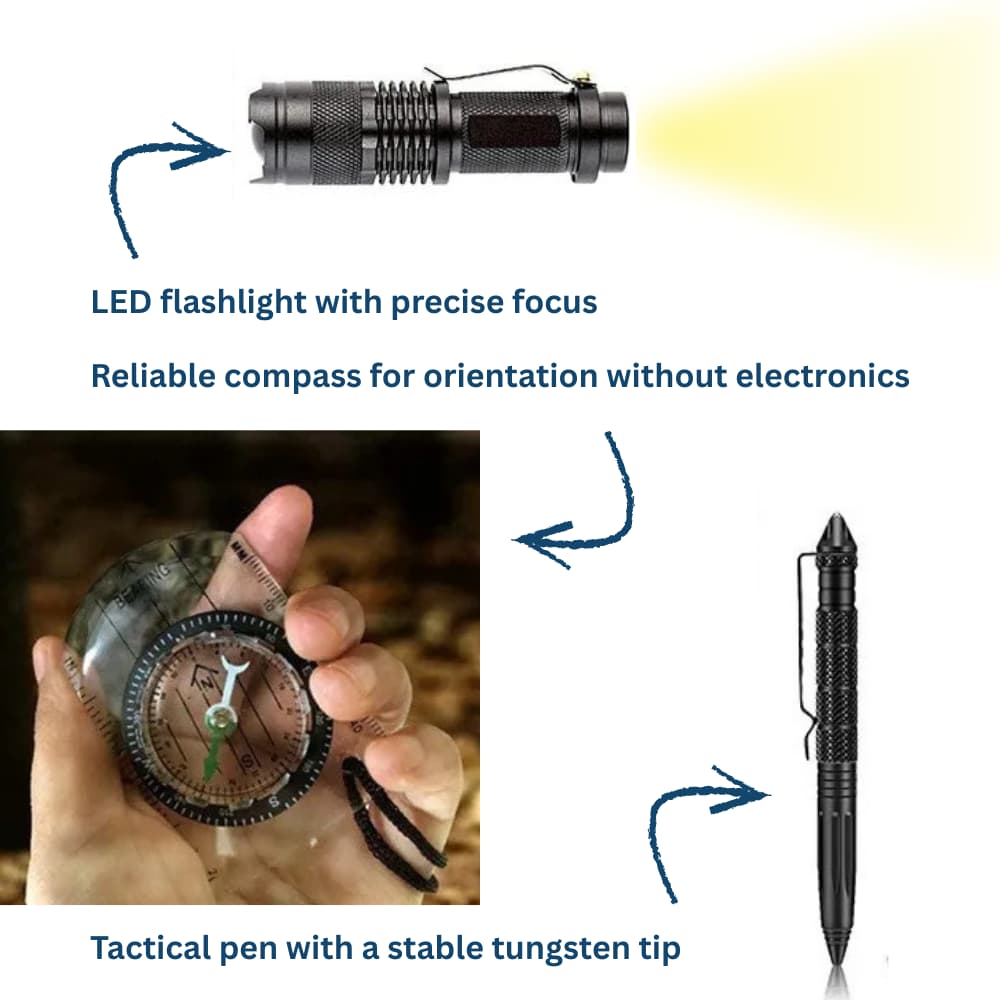 You also have access to a sturdy wire saw, tear-resistant seven-core paracord rope, a practical emergency tent, and a reliable ferro rod, ensuring you are well prepared for demanding outdoor conditions.