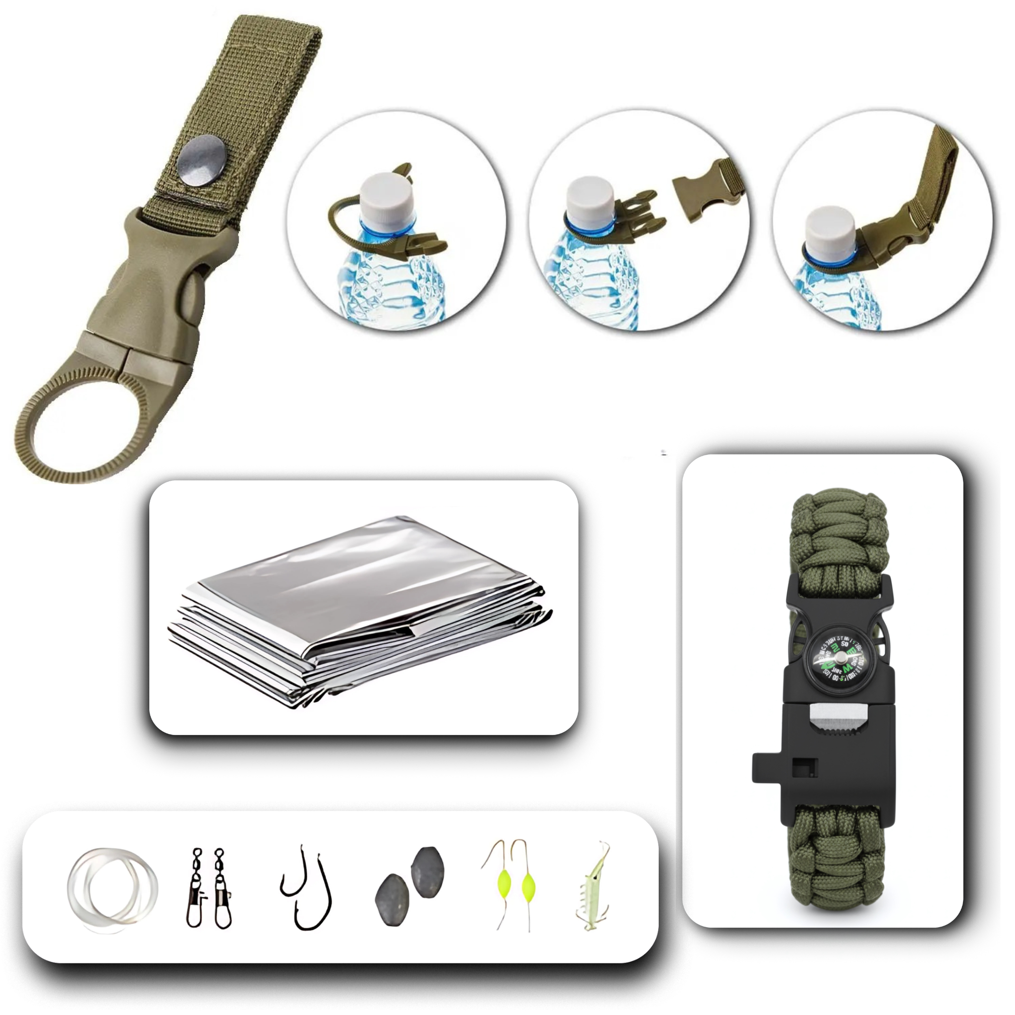 The kit is enhanced with handy extras like the bottle clip, a durable paracord bracelet, and a small fishing lure.