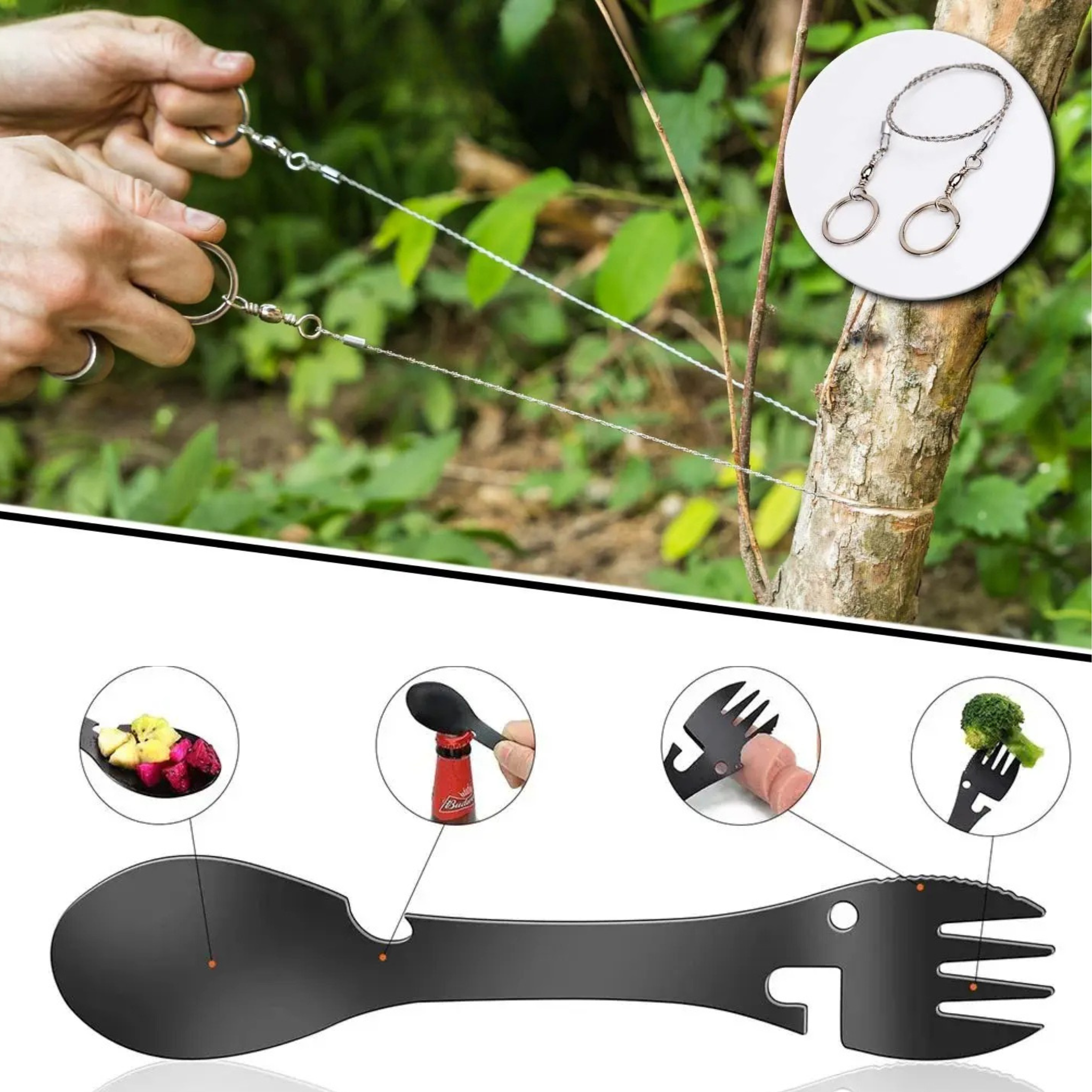From the powerful LED flashlight to the reliable fire starter, the durable wire saw, and the multifunctional cutlery – everything you need for your adventures is included.